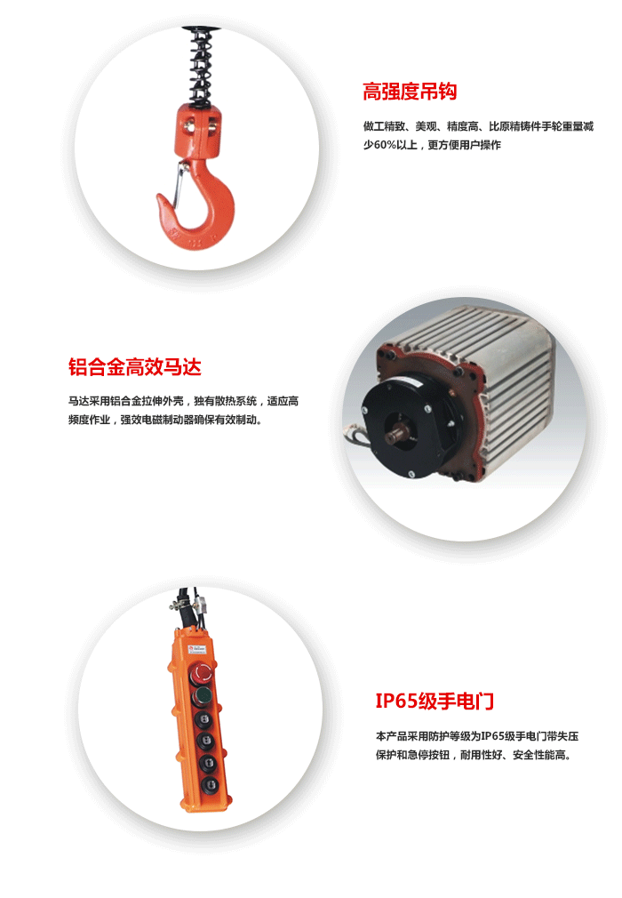 3、零部件強度高本機主要零部件均采用高級合金鋼材料,并經多道特殊熱處理工藝加工,具有強度高、耐磨性好等特點;上、下吊鉤采用高強度合金鋼制作,經強化熱處理后具有很高的韌性,即使機體因超載引起破壞,吊鉤也只會產生朔性變形而不會發生脆性斷裂。