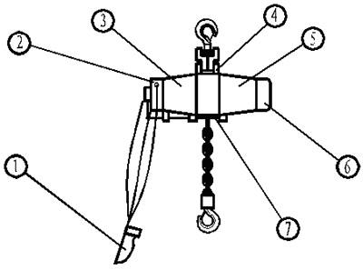 氣動葫蘆主要由: ①手控閥(手柄式和手拉繩式) ②主控閥 ③氣馬達 ④吊掛 ⑤減速器 ⑥剎車機構 ⑦連鎖機構等部分組成,見結構示意圖。這七部分有序的巧妙構成,保證了產(chǎn)品安全有效的運行。