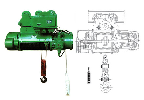 BCD型防爆鋼絲繩電動葫蘆主體可懸掛在工字梁軌道上作直線或曲線運行,或安裝在固定支架上,作為起吊重物之用。可以根據不同使用要求,同防爆單梁懸掛起重機或雙梁橋式起重機配套使用。
