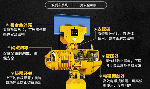 01、極限開關:吊上吊下都有極限開關裝置,到達極限自動停止,防止鏈條脫出;